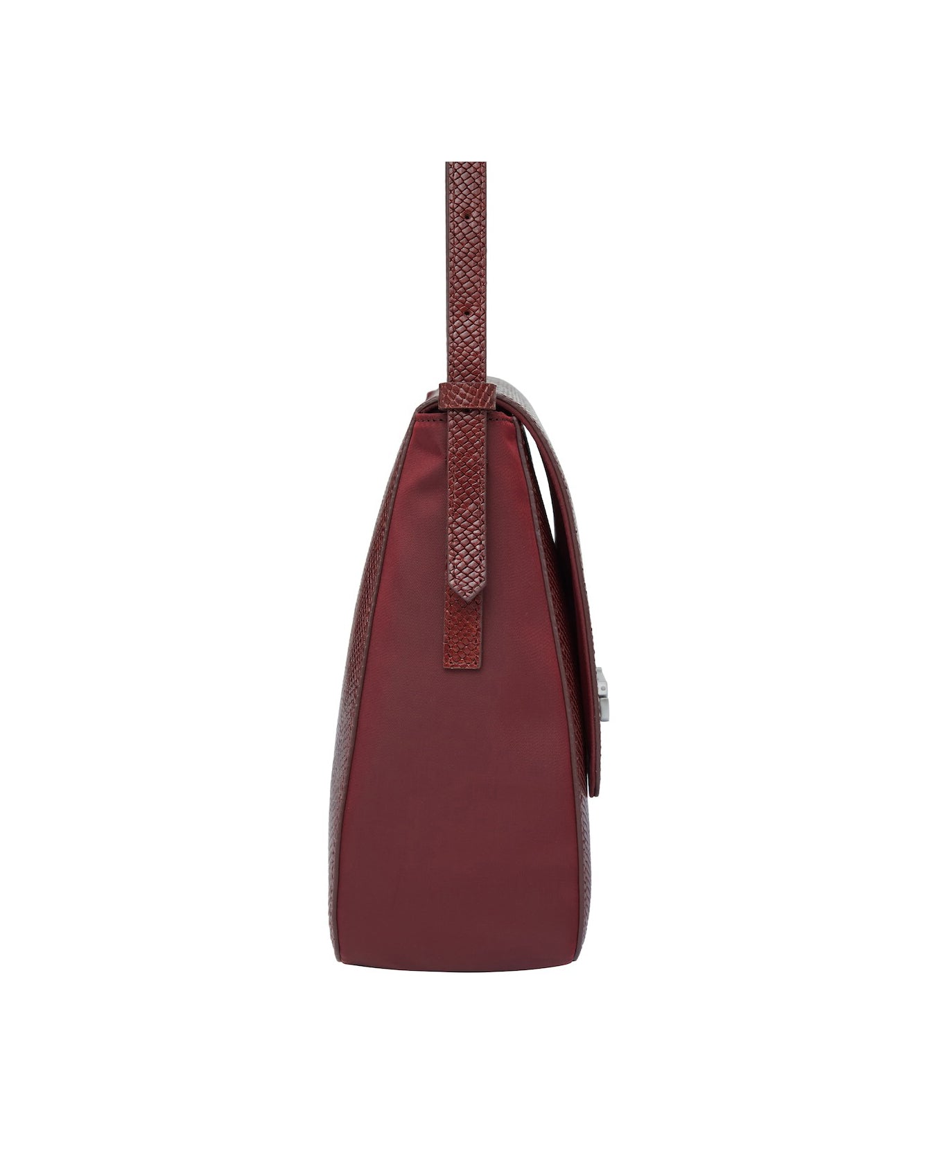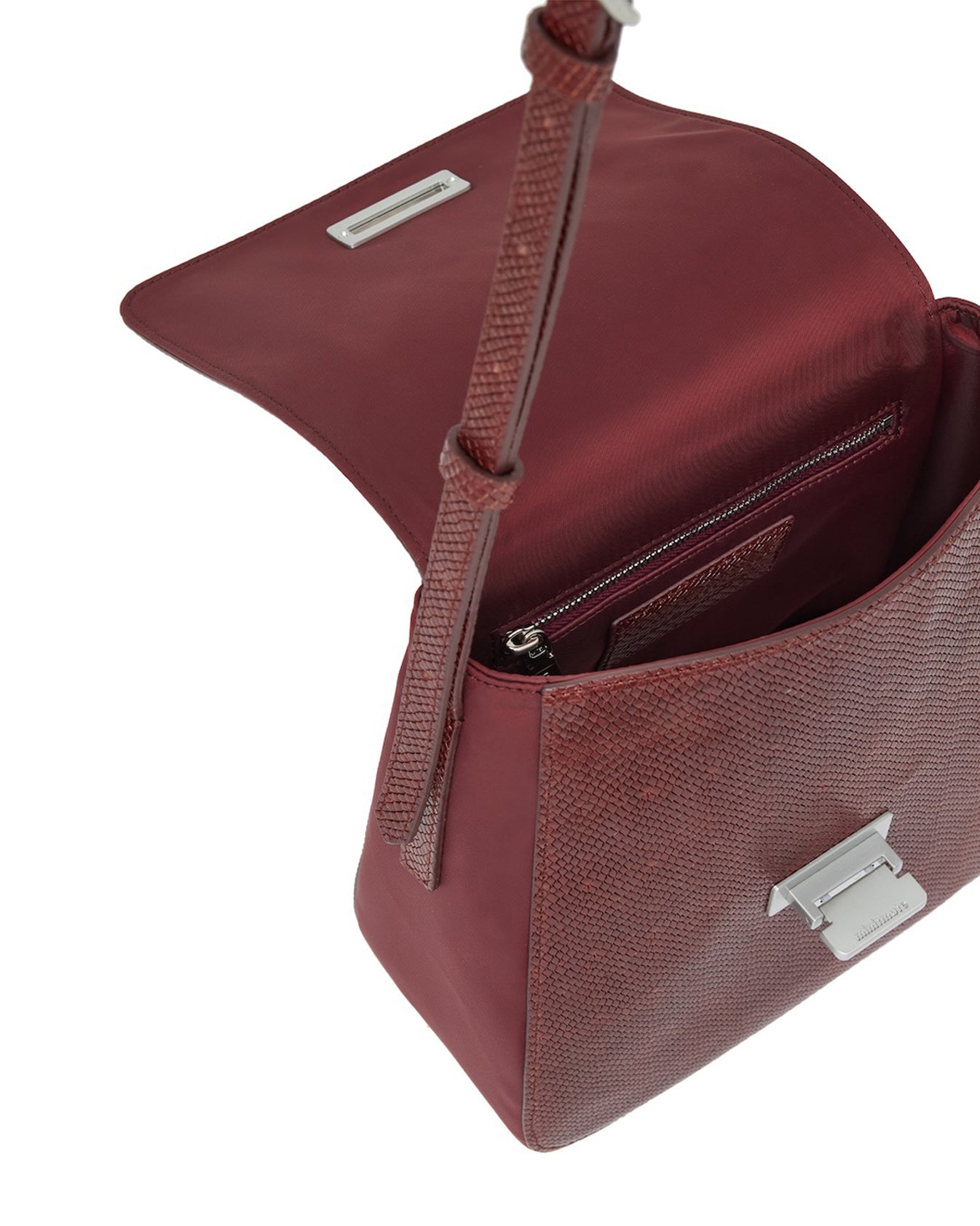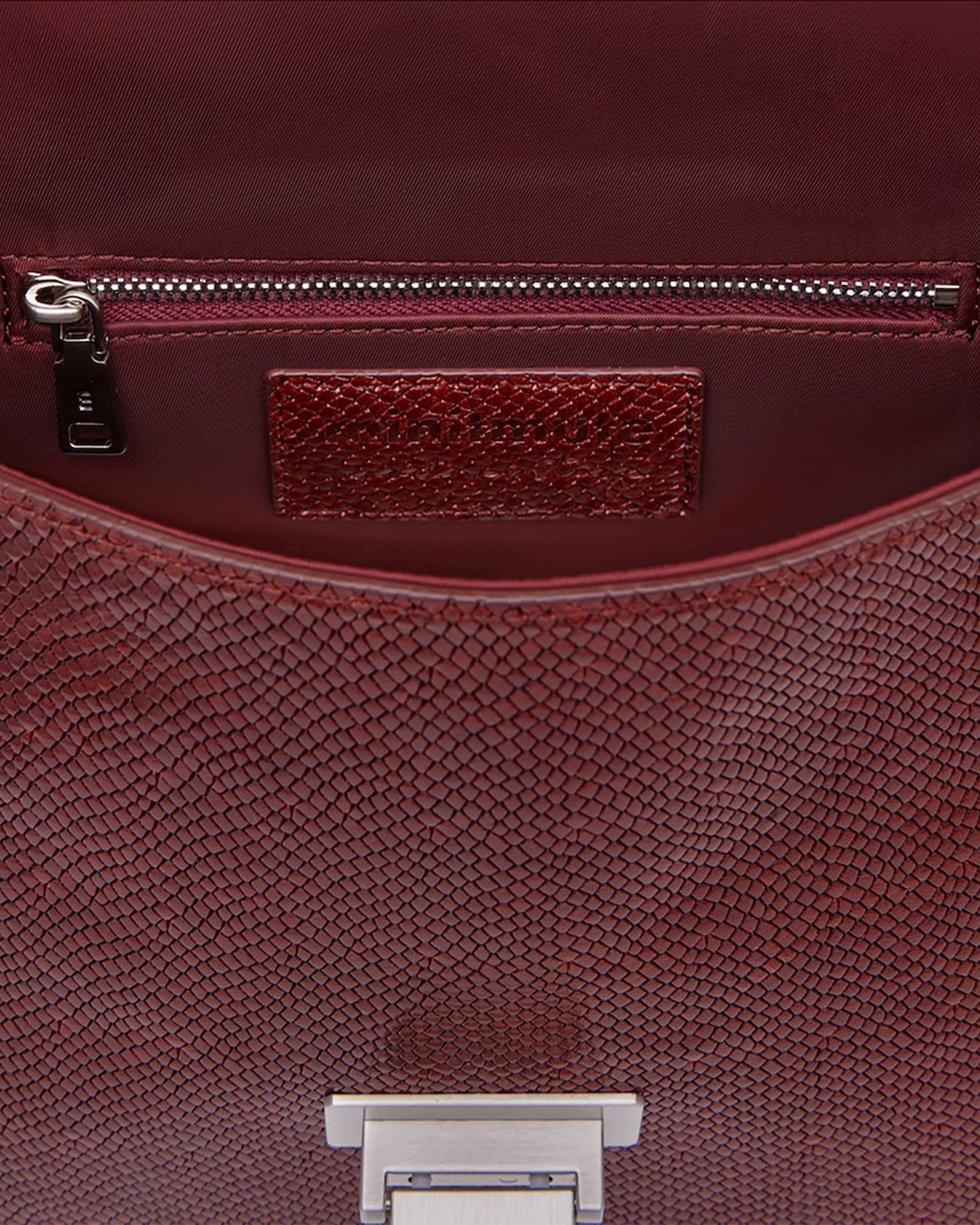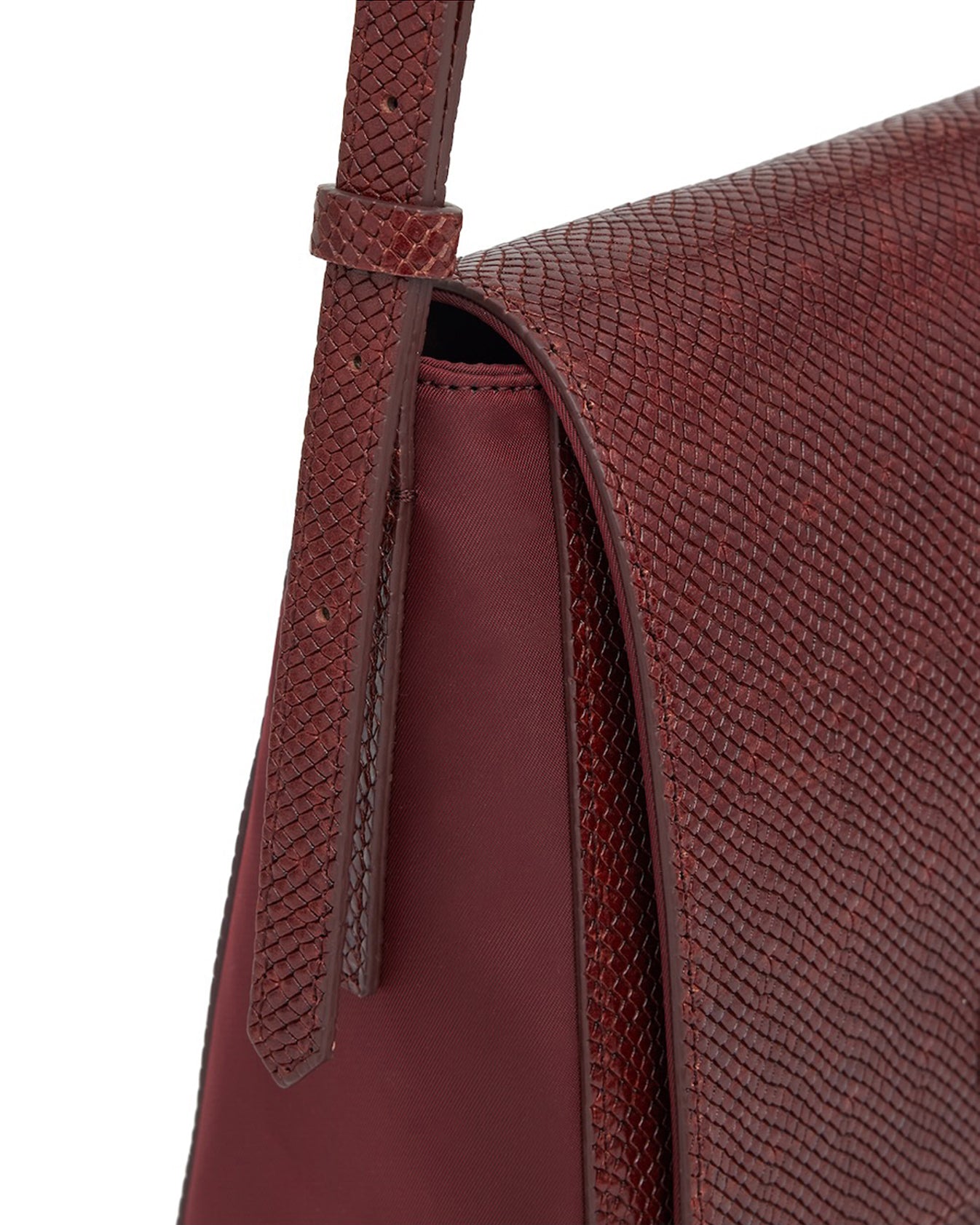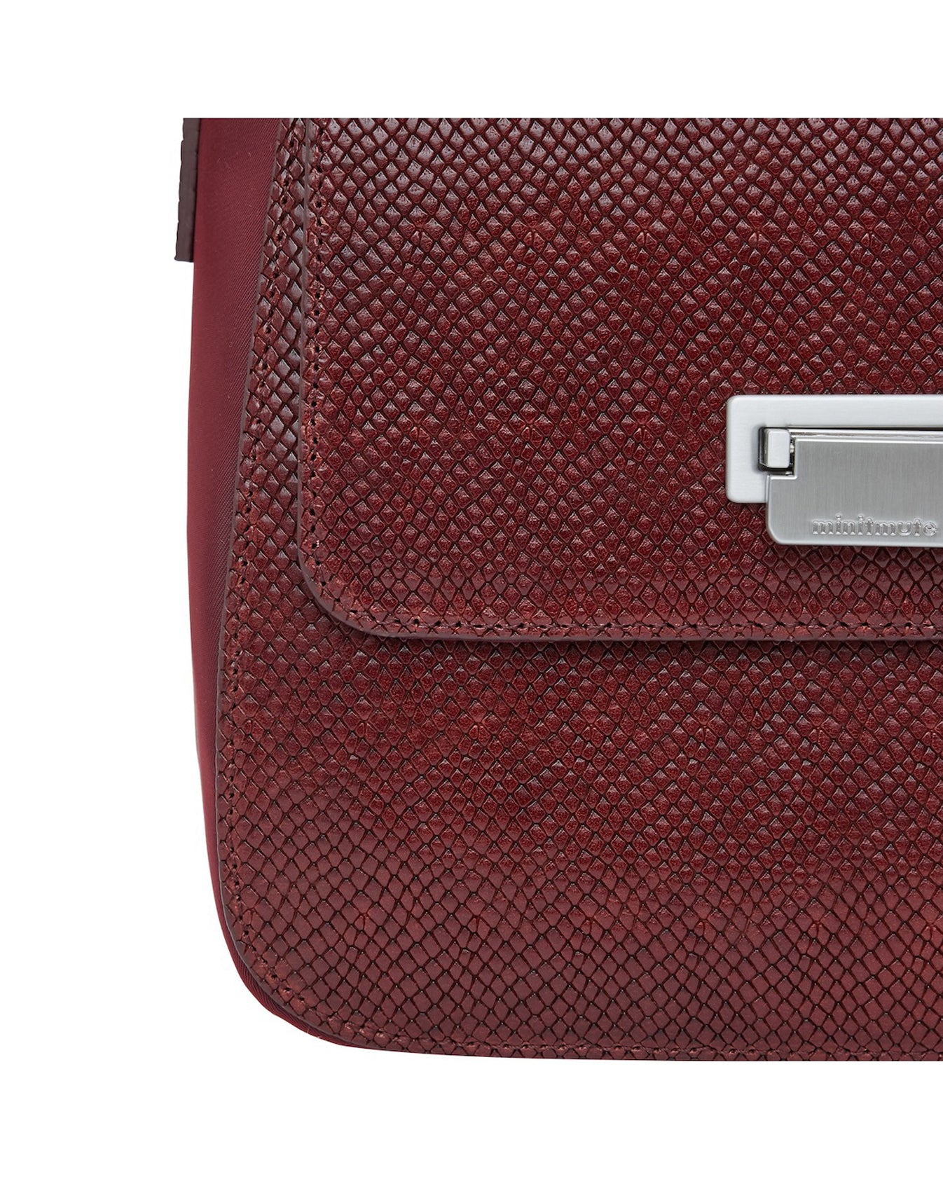This is minitmute tev bag. Crafted from Italian vegetable leather pressed with a lizard pattern, it features intricate details. Infused with oil wax, the leather acquires a subtle sheen and an elegant mood, while aging beautifully over time for a deeper and more stylish look. The sides and interior are crafted from durable yet lightweight nylon heavy twill, adding a casual touch to its luxurious mood. Maximized its attractiveness with YKK zippers, satin nickel, and a new minitmute signature flip lock.