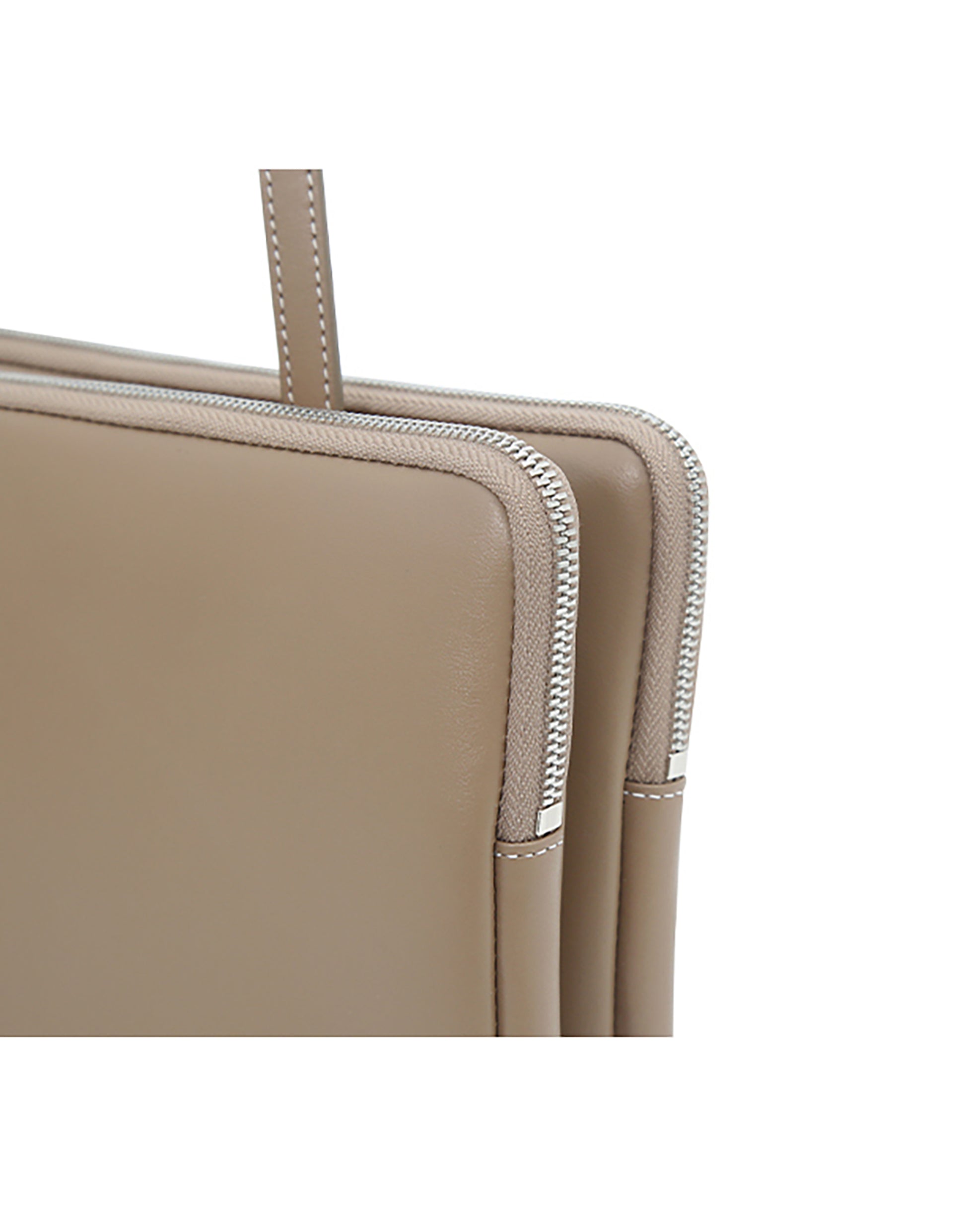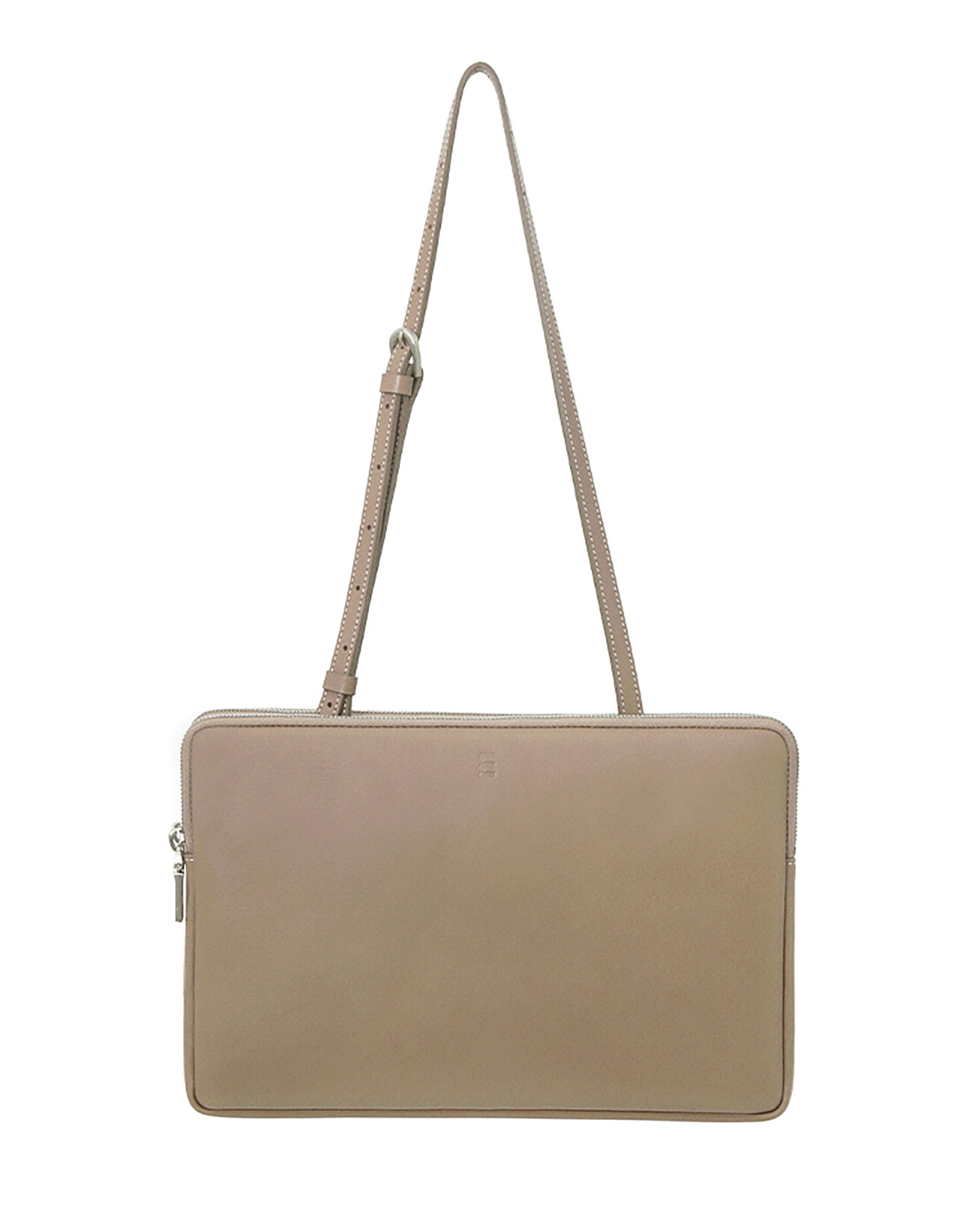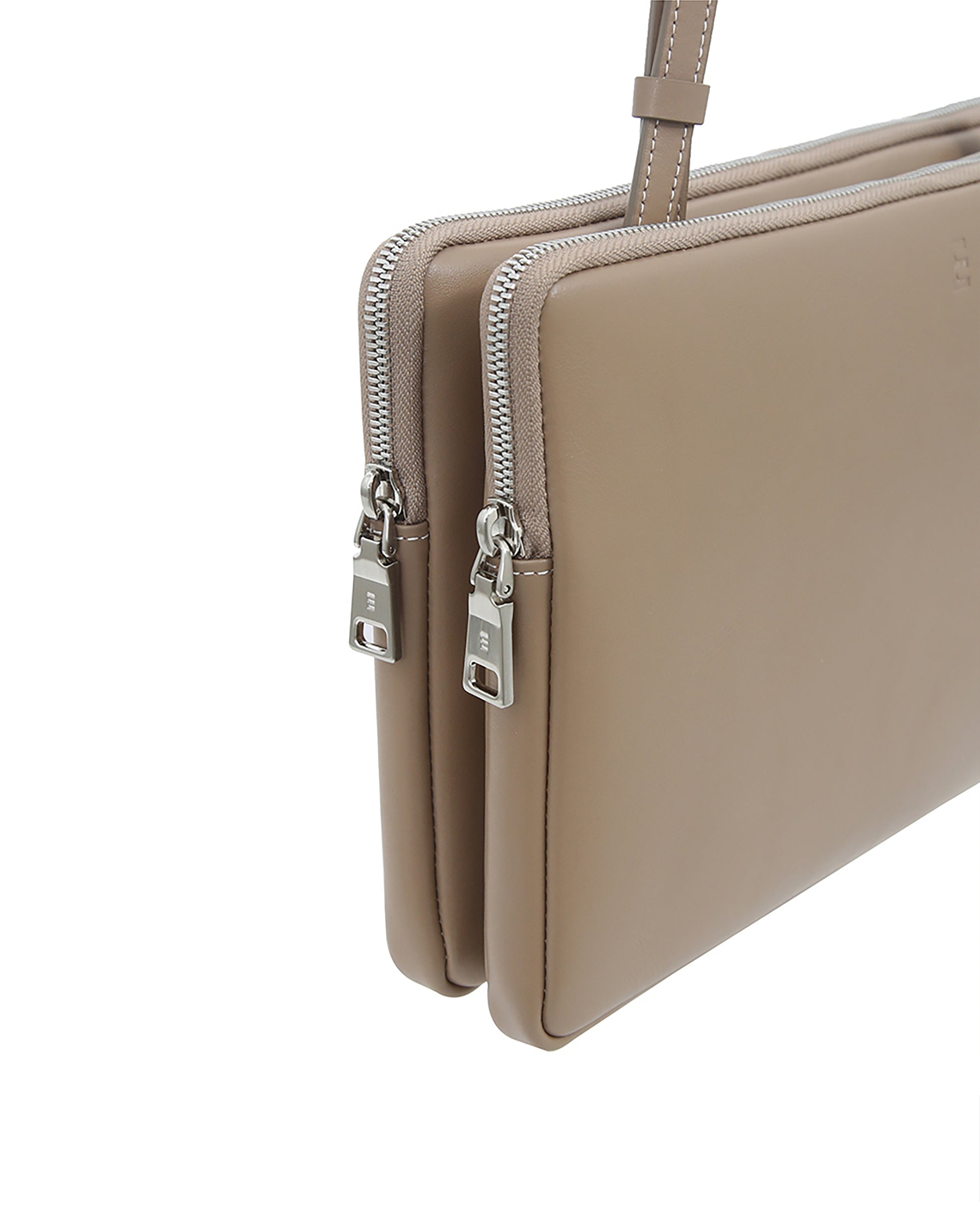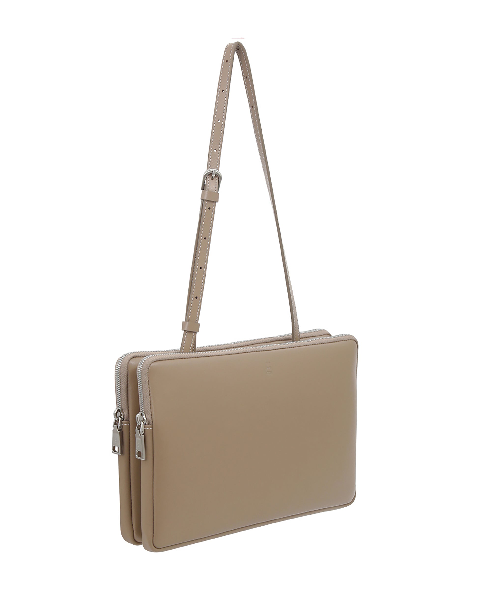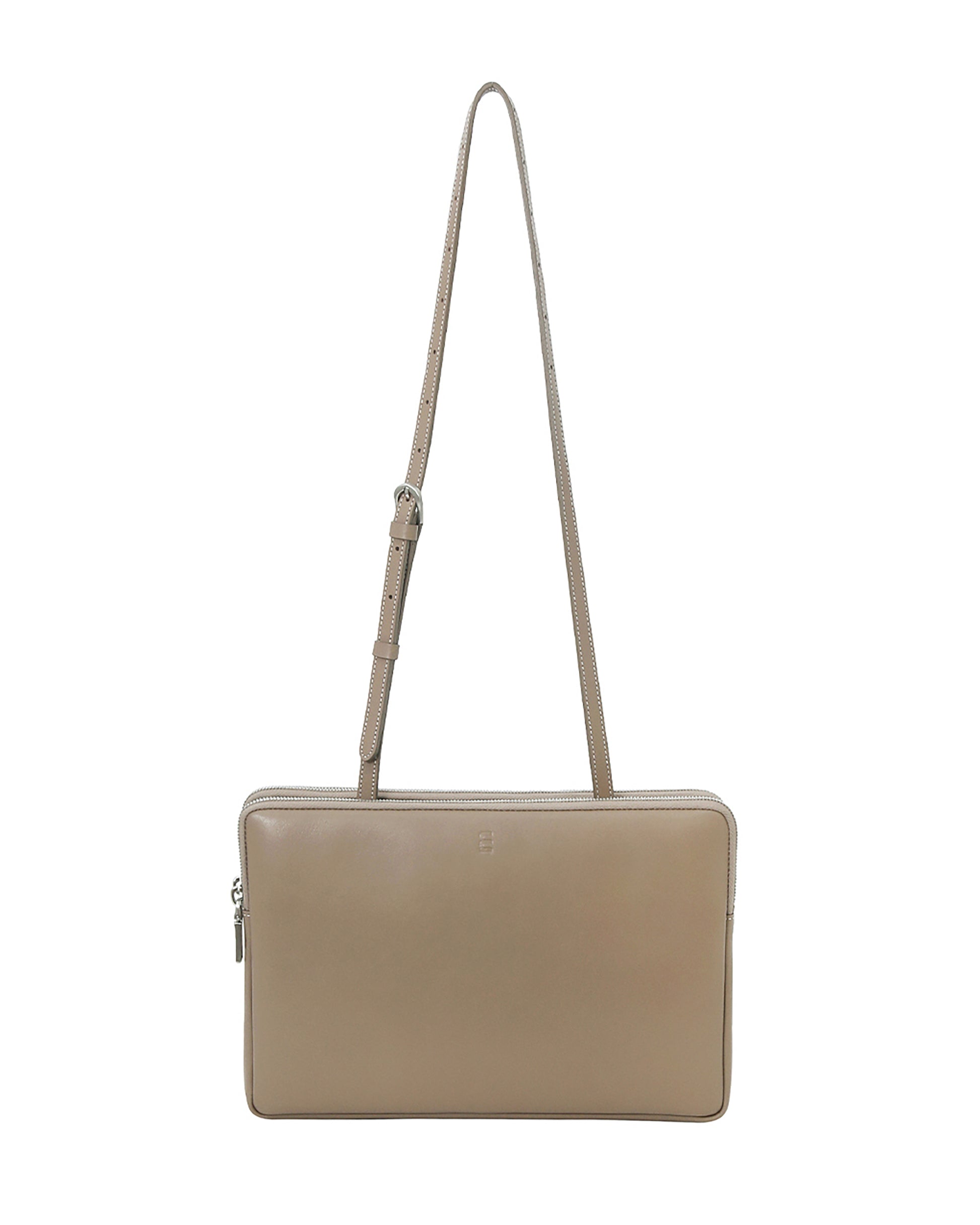 This is minitmute Twin bag. Contamination and scratch resistant Italian Tender Leather is used, and vintage mood is added with YKK zipper and nickel satin matte buckles. It can be used freely as a tote, shoulder, and cross bag, and the two twin-like bodies boast relaxed storage including iPad 11.