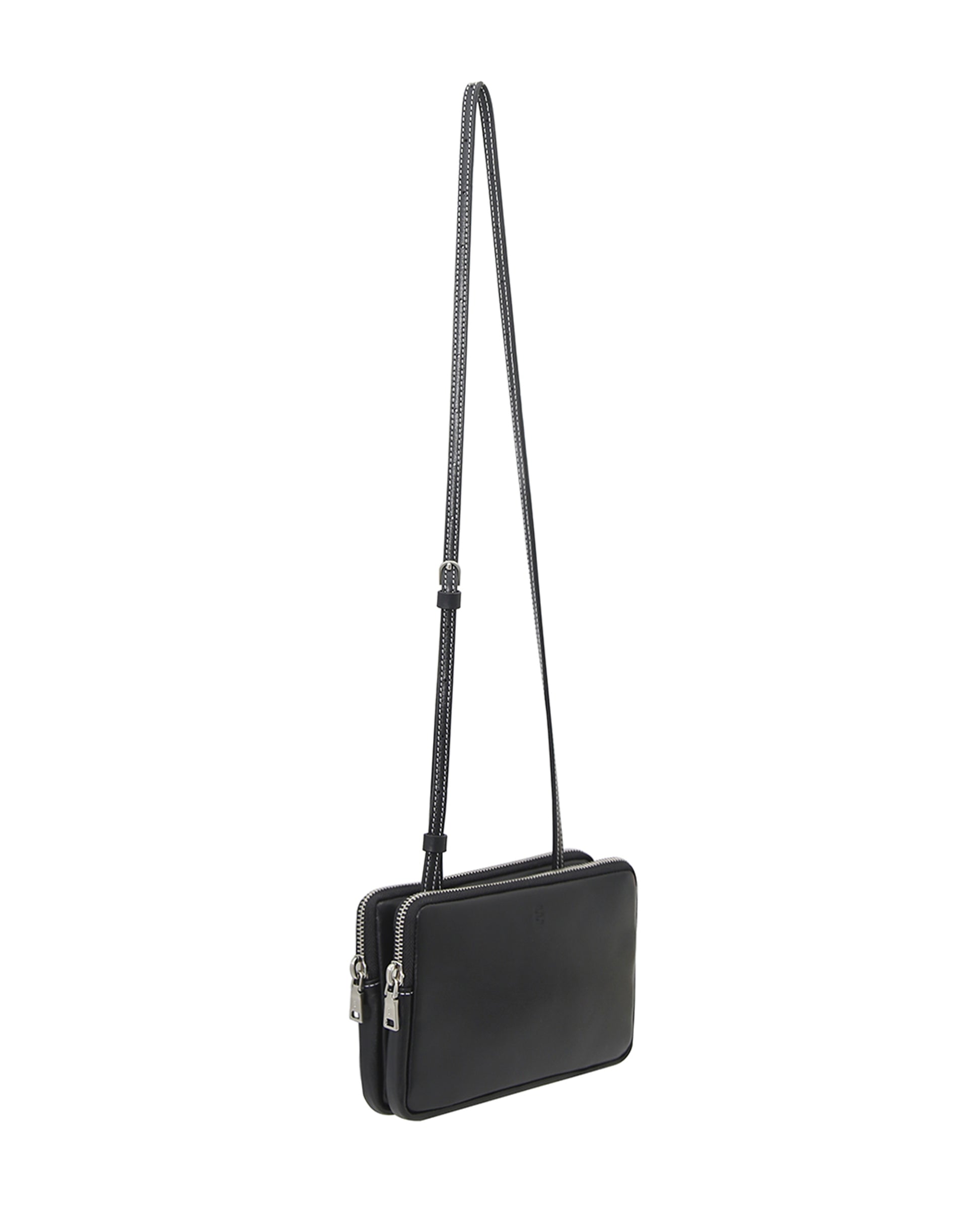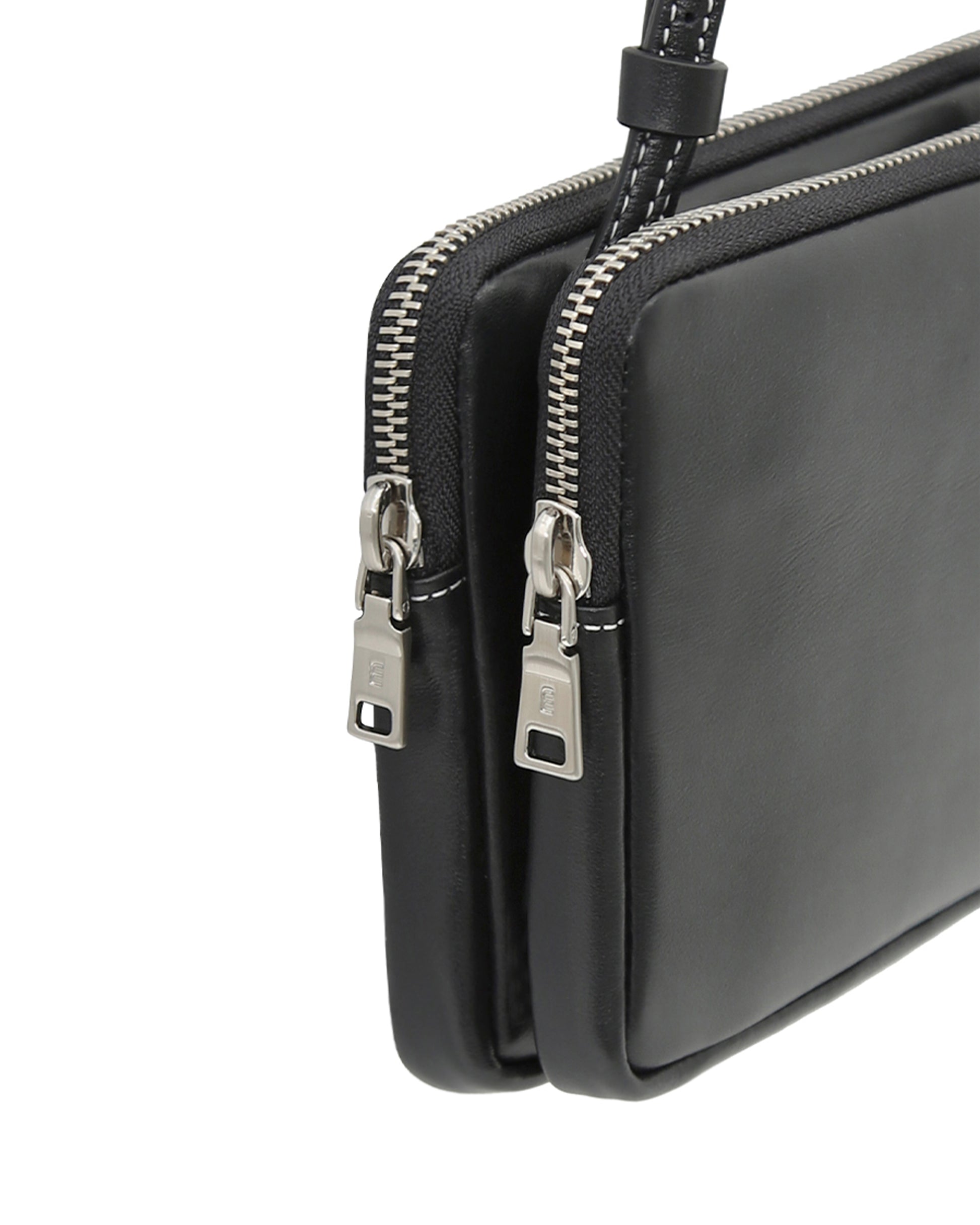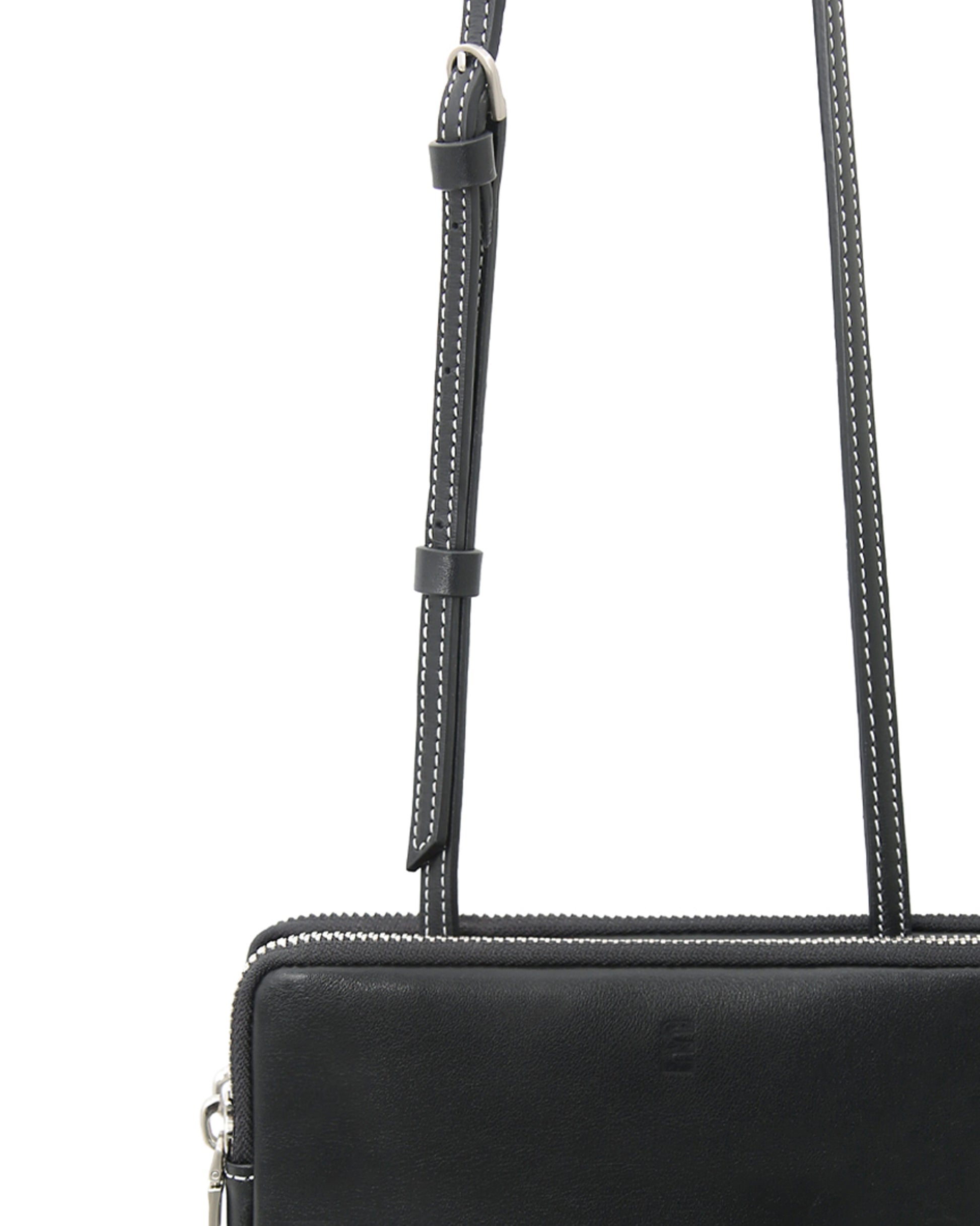 This is minitmute Twin Micro. Made of contamination and scratch-resistant Italian tender leather, and added a vintage touch with a YKK zipper and nickel satin matte buckles. Despite its compact size, it can hold a passport and a phone, making it practical for travel. The two twin-like bodies offer relaxed storage, and the adjustable strap allows for versatile styling as a tote, shoulder, or crossbody bag.